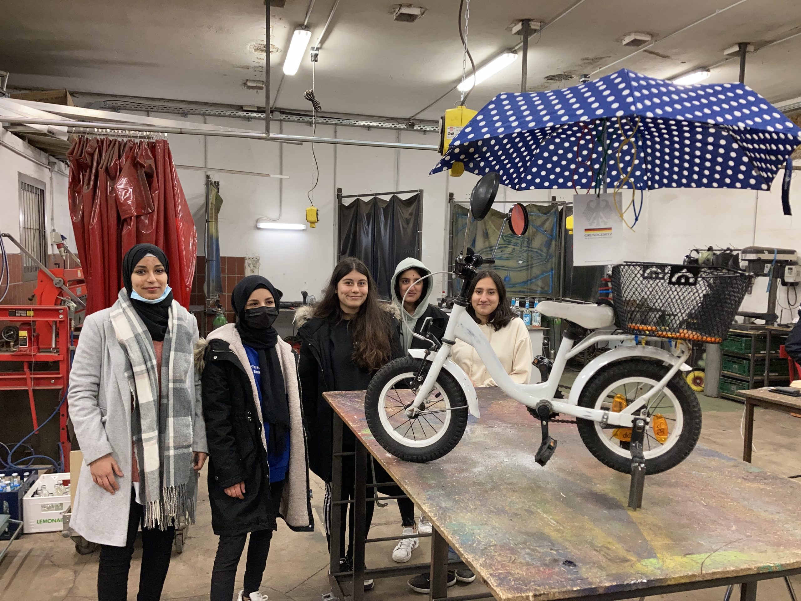 Dort machten wir uns an die Umsetzung unserer „Demokratiemaschinen“. Es wurde geschraubt gesägt, gebohrt, gehämmert, verborgene Talente entdeckt. Handwerkliche Unterstützung erhielten wir vor Ort von Dennis, der alles sägte, schweißte und flexte, was an- oder abgebaut werden musste. Angepackt haben auch die begleitenden Lehrkräfte, Herr Lühring und Herr Hegeler. Den Rest erledigten die Schüler*innen von selbst und präsentierten am Ende eines langen Tages stolz ihre Demokratiemaschinen. Was gebaut wurde? Eine Waschmaschine, eine Art Murmelbahn, eine Filteranlage, ein Bingo-Stationenspiel und ein Fahrrad (s. Fotos).
